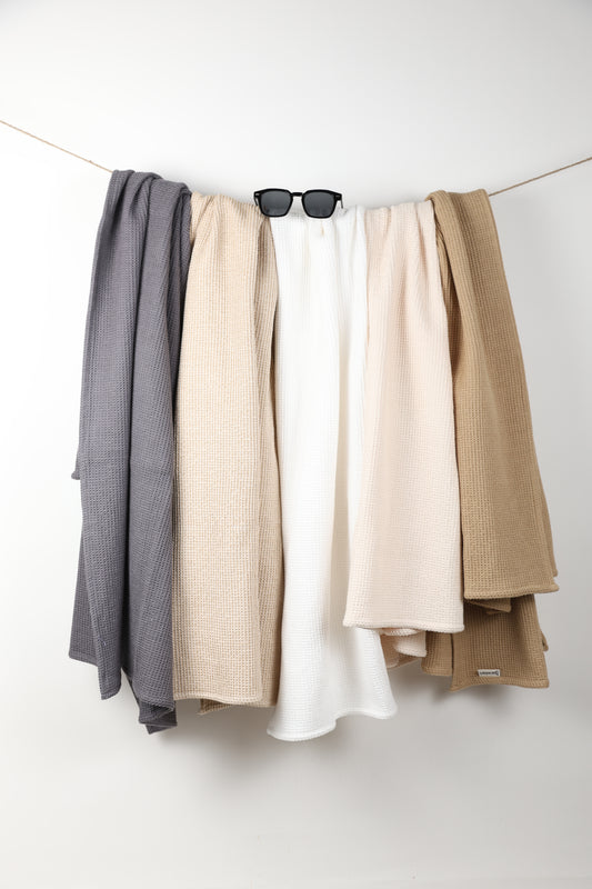 The luxuriously soft bathroom essential is crafted from absorbant fabric and features a contemporary waffle weave. The texture enhances surfaces area for maximum absorbtion & provides an exfoliation experience like no terry towel can. We have engineered the fabric to make it fluffy and breathable without the extra weight. GSM isn't all that.