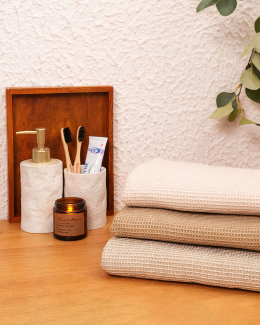 The luxuriously soft bathroom essential is crafted from absorbant fabric and features a contemporary waffle weave. The texture enhances surfaces area for maximum absorbtion & provides an exfoliation experience like no terry towel can. We have engineered the fabric to make it fluffy and breathable without the extra weight. GSM isn't all that.